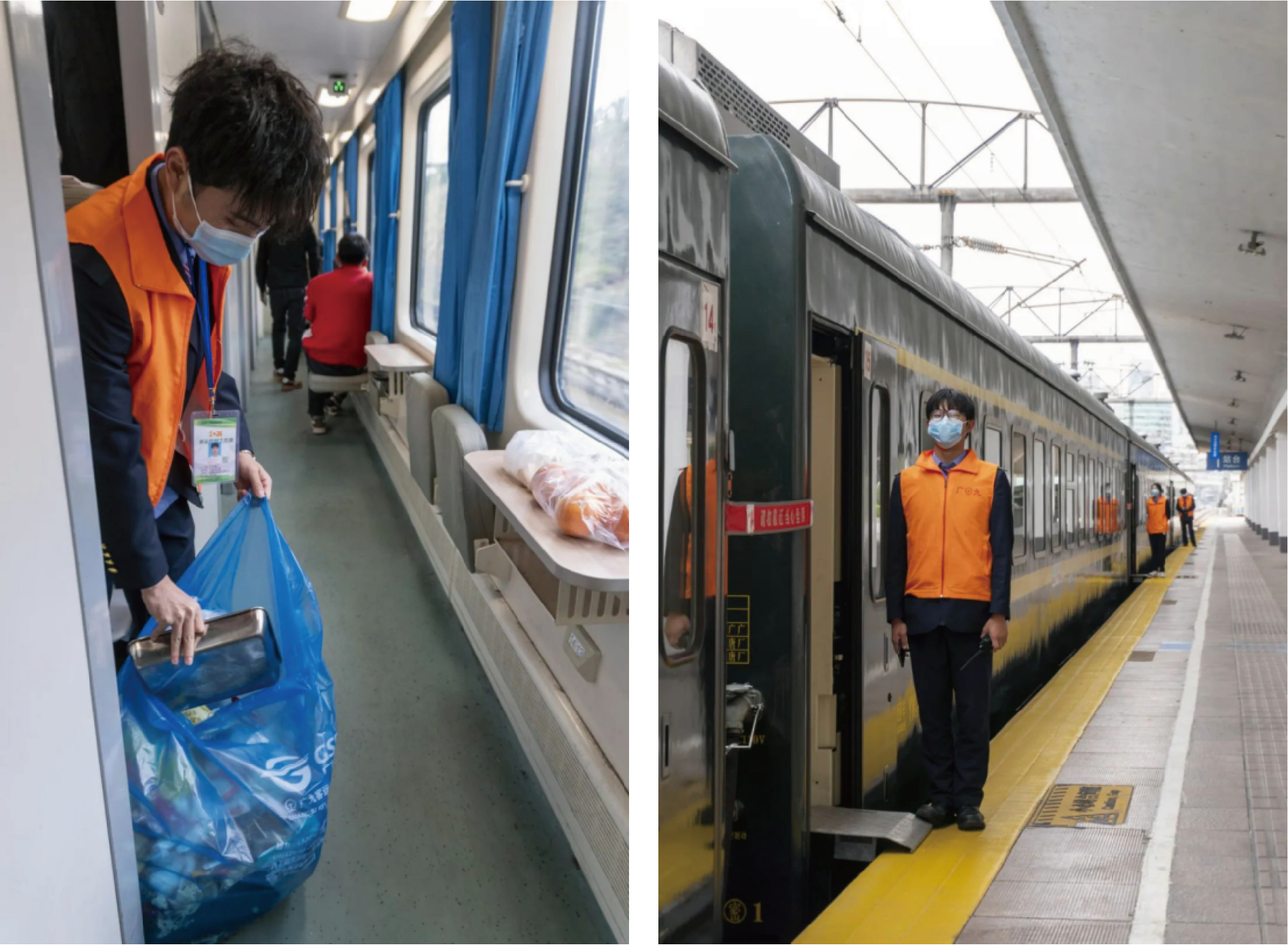 ▲值班同学们正在车门处立岗及打扫车厢内卫生